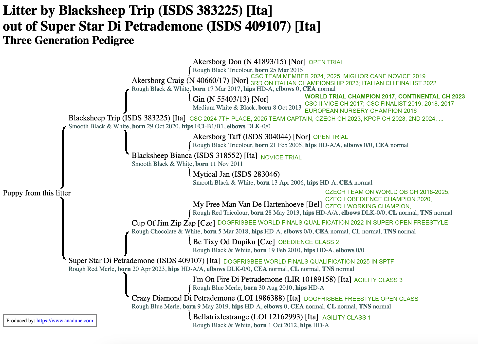 In daily life, Trip helps Lucie and Jakub on the farm with both sheep and cattle. He regularly competes in open class trials with excellent results and ranks among the very top working border collies in the Czech Republic, or even in Europe. He has never trained other sports, but both him and his offspring show a nice set of traits a sport dog should have. They are playing with toys, retrieving, effortlessly moving, and jumping with a good and safe technique. Most of his puppies are herding dogs, though there are also some that are trained in dogfrisbee, search and rescue, nosework, and some that are still growing but already nicely learning the basics of agility. Some of his oldest pups were health tested and each of them has clear results.