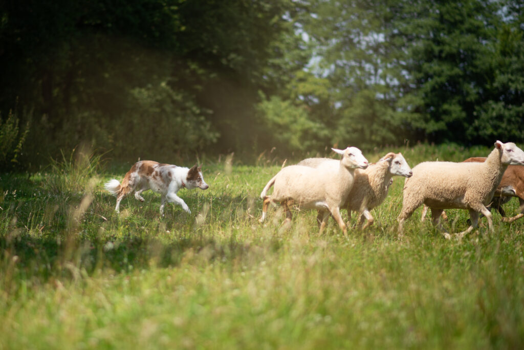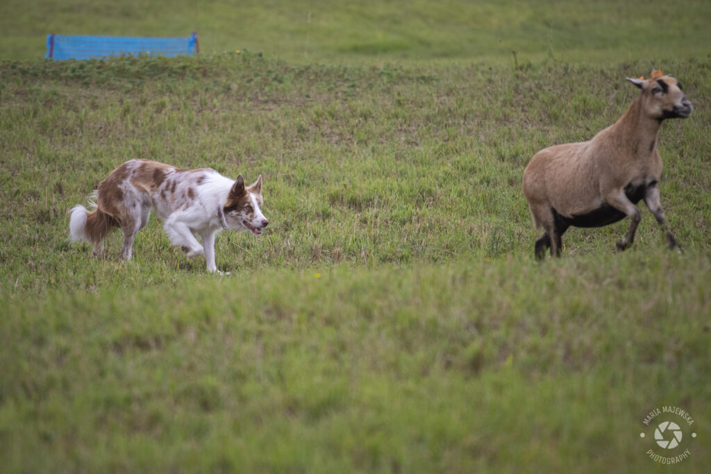 Hauru is a rather powerful, mentally strong dog. She doesn’t get discouraged or give up on work due to pressure from her handler, animals, or a decoy in IGP defense. She’s brave and confident, excelling with stubborn sheep that try to intimidate her. She was never afraid to stand her ground, and with a cool head, she gains control over the animals. She progresses quickly in herding, she loves it. Working with her is very pleasurable, even if she’s quite a challenging dog for a new handler, due to her high speed, quick reactions, being always one step ahead of me 😉 She naturally likes driving the sheep and prefers it over flanking.